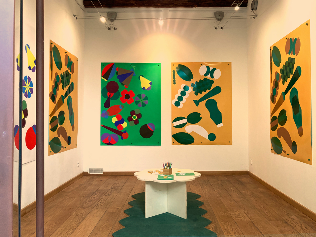 The Herbier exhibition offers an immersion into the graphic universe of Fanette Mellier and accompanies her upcoming book to be published by Éditions du livre. Large screen-printed posters cover the walls with floral and plant motifs. On the table, 32 cut-out shapes are available for visitors to compose and color their own herbarium of colors!