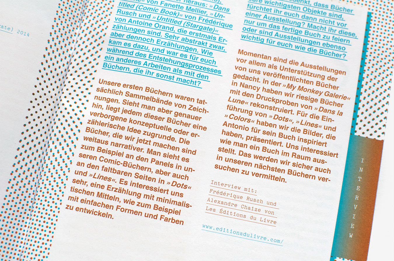 M-L S : Avant la dernière série de livre que vous avez édité («Dots», «Lines» et «Colors» de Antonio Ladrillo), sont parus 3 livres («Dans la lune» de Fanette Mellier, «Untitled (Comic Book)» de Frédérique Rusch, «Untitled (Stargate)» de Antoine Orand) qui pour la première fois (je crois) proposent une narration, assez abstraite pour certains, mais narration quand même. D’où est ce que cela vient et est ce qu’il y avait un rapport différent avec ces livres lors de leur confection d’avec les autres livres?
